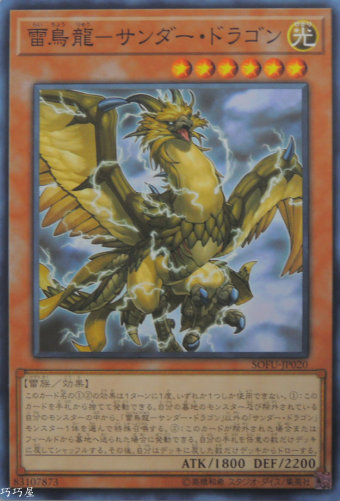 0 | SOFU-JP020 | 雷鳥龍-雷龍 | 效果怪獸 | 等級6 | 光 | 雷族 | 普卡 | 1800 | 2200 | 83107873 | 內容 |