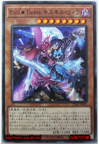 | 0 | TT01-JPB01 | Evil★Twins 綺斯綺兒莉菈 | 特殊召喚 | 等級8 | 闇 | 惡魔族 | 普卡 | 2200 | 2200 | 62098216 | 內容 |