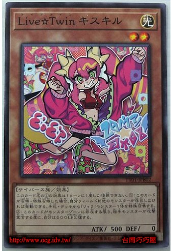 | 0 | TT01-JPB02 | Live☆Twin 綺斯綺兒 | 效果怪獸 | 等級2 | 光 | 電子界族 | 普卡 | 500 | 0 | 36326160 | 內容 |