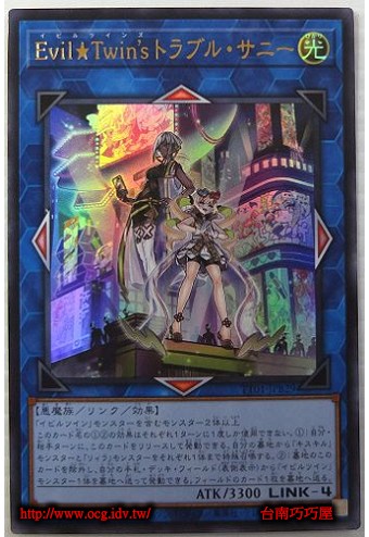 連結標記:上/下/左/右 包含「Evil★Twin」怪獸的怪獸2體以上 此卡名的(1)(2)效果分別1回合只能使用1次。 (1): 在我方・對手回合,將此卡解放可發動。 從我方墓地選擇「綺斯綺兒」與「莉菈」怪獸分別最多1體特殊召喚。 (2): 將墓地的此卡除外, 並從我方手牌・牌組・場上(表側表示)將「Evil★Twin」怪獸1體送入墓地可發動。 將場上的卡片1枚送入墓地。 |