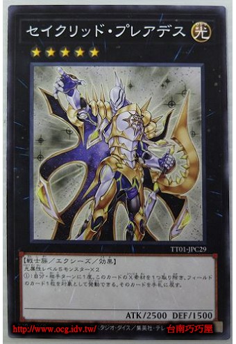 | 0 | TT01-JPC29 | 昴宿星聖 | 超量怪獸 | 階級5 | 光 | 戰士族 | 普卡 | 2500 | 1500 | 73964868 | 內容 |