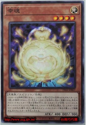 0  TT02-JPB07  幸魂  靈魂怪獸  等級4  光  天使族  普卡  400  900  67972302  內容