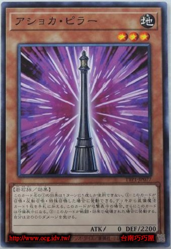 | 0 | TTP1-JP077 | 阿育王柱 | 效果怪獸 | 等級3 | 地 | 岩石族 | 普卡 | 0 | 2200 | 58996839 | 內容 |