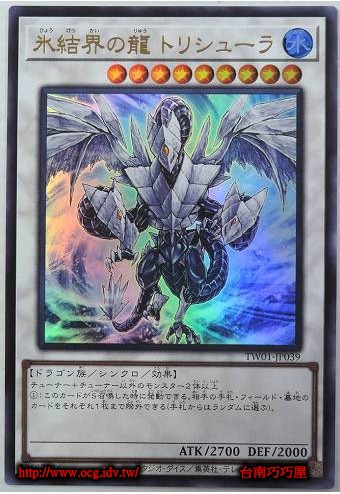 | 0 | TW01-JP039B | 冰結界之龍三叉戟 | 同步怪獸 | 等級9 | 水 | 龍族 | 金亮 | 2700 | 2000 | 52687916 | 內容 |