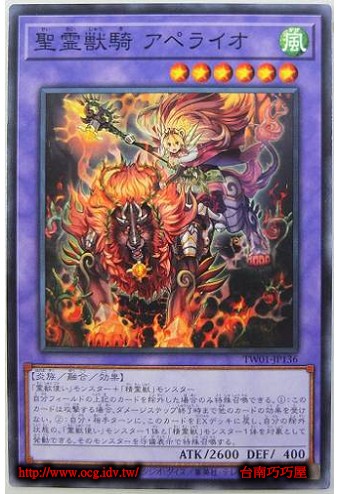 0 | TW01-JP136 | 聖靈獸騎 炎獅 | 融合怪獸 | 等級6 | 風 | 炎族 | 普卡 | 2600 | 400 | 86274272 | 內容 |