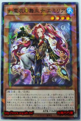 0 | TW02-JP073 | 影靈衣的舞巫女 艾蜜莉雅 | 效果怪獸 | 等級4 | 水 | 魔法使族 | 普鑽 | 1600 | 800 | 87003671 | 內容 |