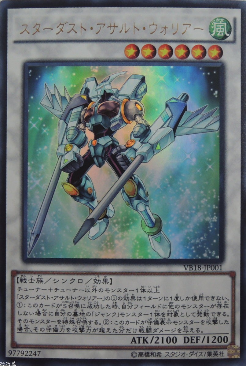 0 | VB18-JP001 | 星塵強襲戰士 | 同步怪獸 | 等級6 | 風 | 戰士族 | 金亮 | 2100 | 1200 | 97792247 | 內容 |
