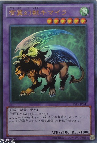 0 | 15AY-JPB41 | 有翼幻獸奇美拉 | 融合怪獸 | 等級6 | 風 | 獸族 | 金亮 | 2100 | 1800 | 04796100 | 內容 |