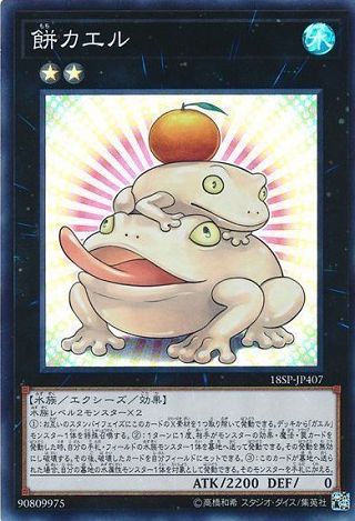 水族等級2怪獸×2 (1): 每逢雙方準備階段將此卡的超量素材1個去除可發動。 從牌組將「青蛙」怪獸1體特殊召喚。 (2): 1回合1次,對手將怪獸效果・魔法・陷阱卡發動時,將我方手牌・場上的水族怪獸1體送入墓地可發動。 將其發動無效並破壞。 之後,可將被破壞的卡片於我方場上覆蓋。 (3): 此卡被送入墓地的場合,以我方墓地的水屬性怪獸1體為對象可發動。 將該怪獸加入手牌。 |