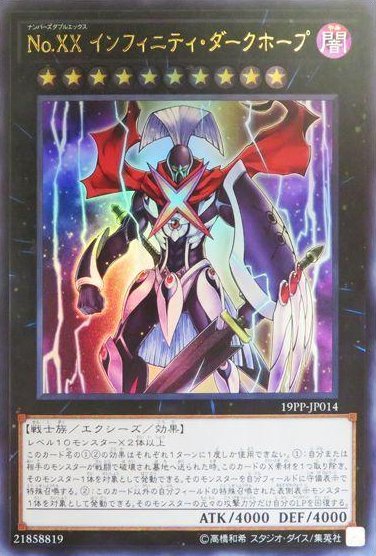 | 0 | 19PP-JP014B | No.XX 無限黑暗霍普 | 超量怪獸 | 階級10 | 闇 | 戰士族 | 金亮 | 4000 | 4000 | 32858819 | 內容 |